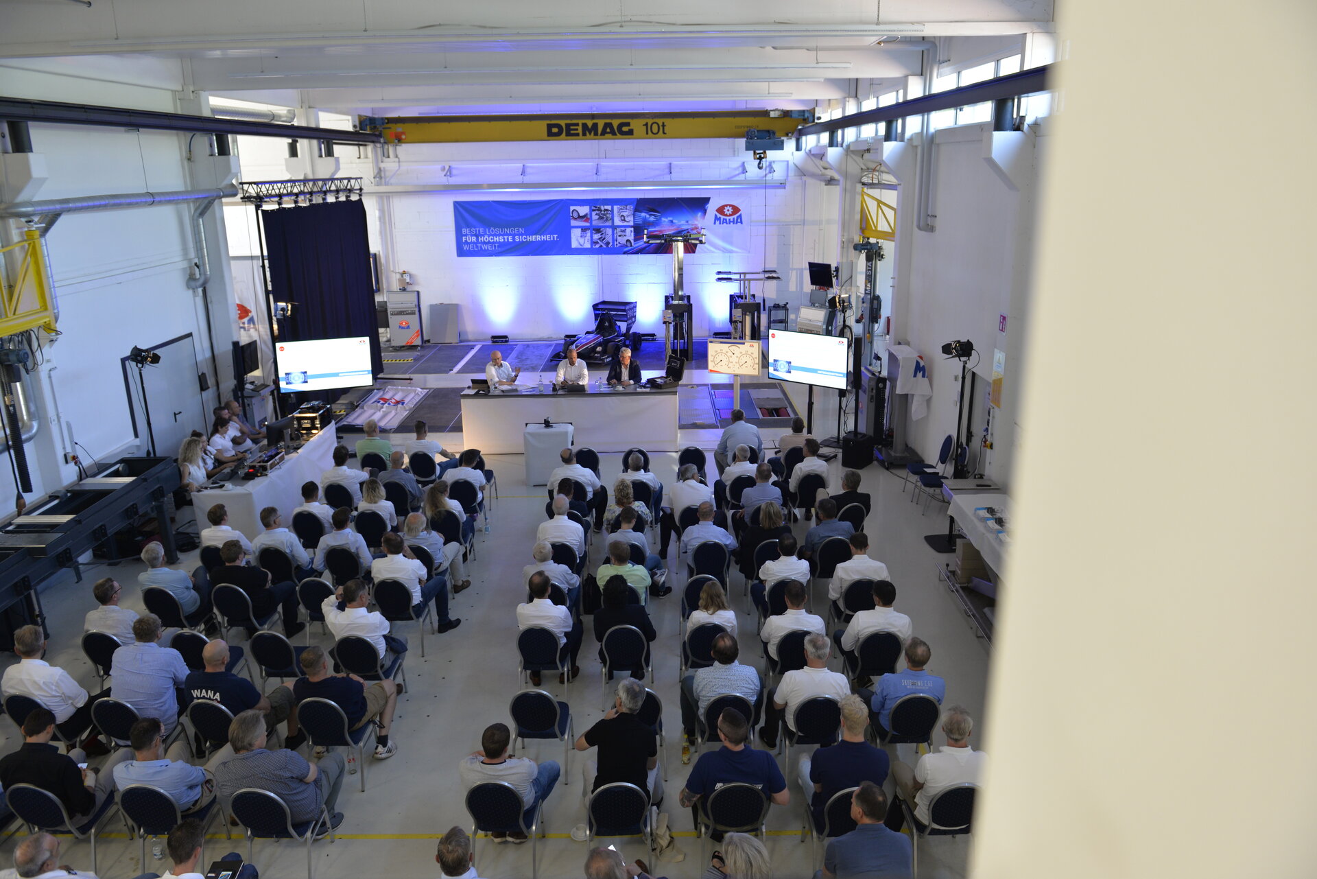 Das jüngste Produkt aus dem Hause MAHA wurde am 30. Juni 2022 im MAHA Training Center in Haldenwang vor über 100 Live-Teilnehmern vorgestellt. Für alle Geladenen, die nicht persönlich anreisen konnten, bestand die Möglichkeit, sich digital zum Event dazuzuschalten. Diese Chance nutzten mehr als 200 Online-Teilnehmer. Insgesamt verfolgten Partner, Kunden, Freunde und Fachpresse aus über 35 Ländern das einzigartige, zweisprachige Event. Nach dem theoretischen Teil des „Product Launch“ fiel der schwarze Vorhang und enthüllte unter Nebel den Star des Tages: den CONNECT LKW mit einem zur Prüfung stehenden gelben US Schoolbus. Damit konnten sich die Teilnehmer persönlich und virtuell von den „10 von 10 Produktvorteilen“, die für die Beschaffung eines CONNECT-Bremsprüfstandes sprechen, überzeugen.