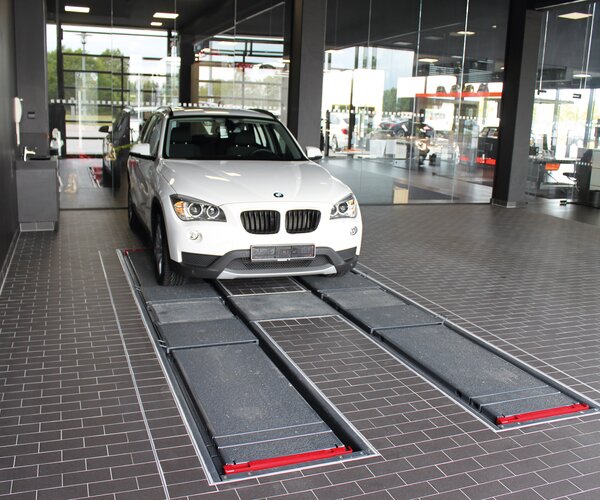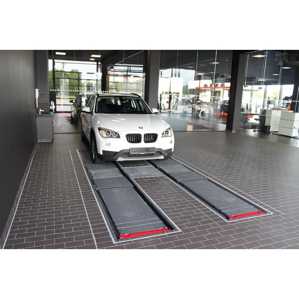 - Optionaler Ausbau zur Fahrwerksvermessungs-Hebebühne mit exakt ausgerichteten Fahrflächen, Schiebeplatten zur