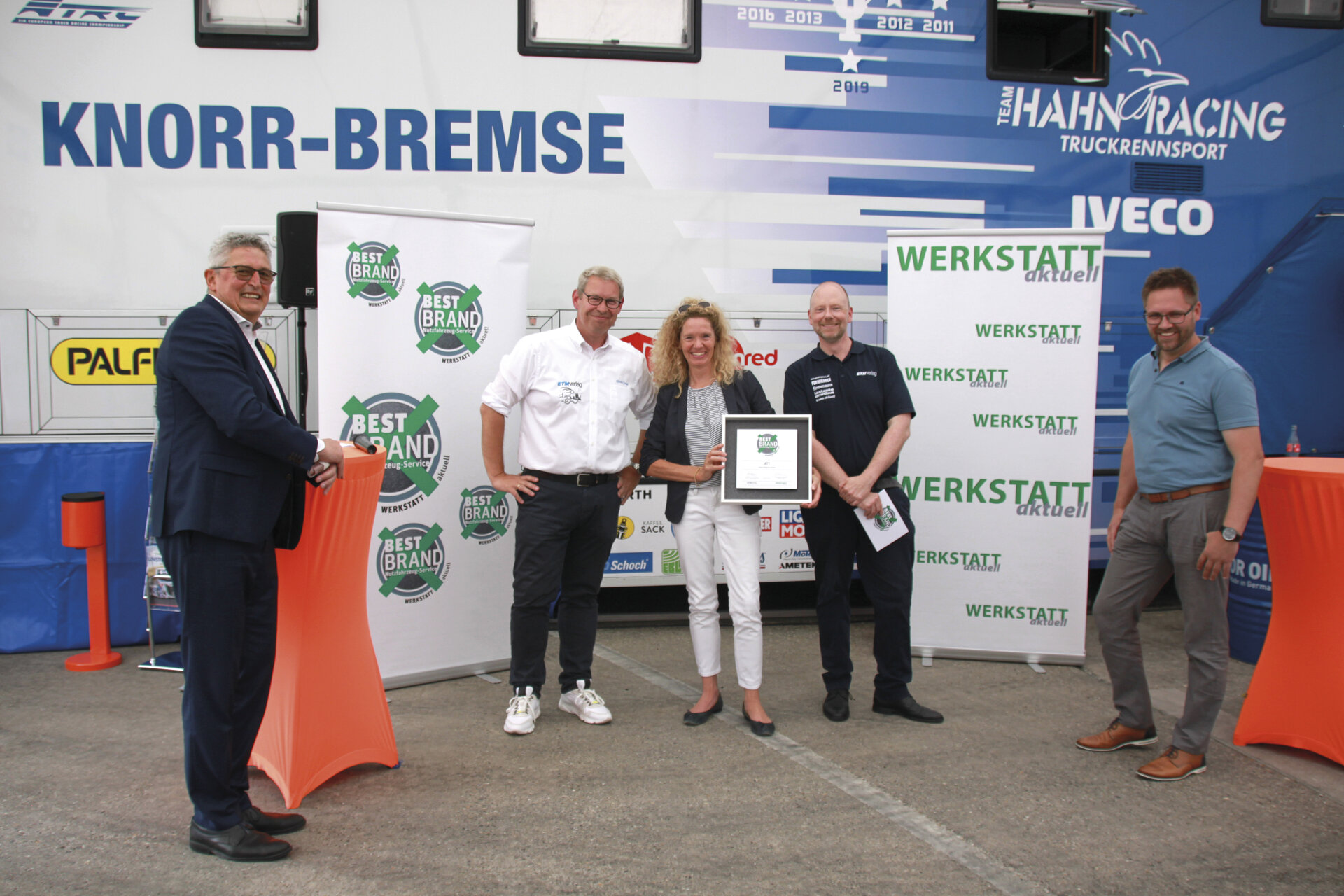 In Markbronn near Blaustein, Mrs Müller-Lengdobler (Marketing Team Leader), Mr Lars Richter (Media Designer) and Stefan Fuchs were delighted to accept the prize on the grounds of the Iveco Truck Race test track.