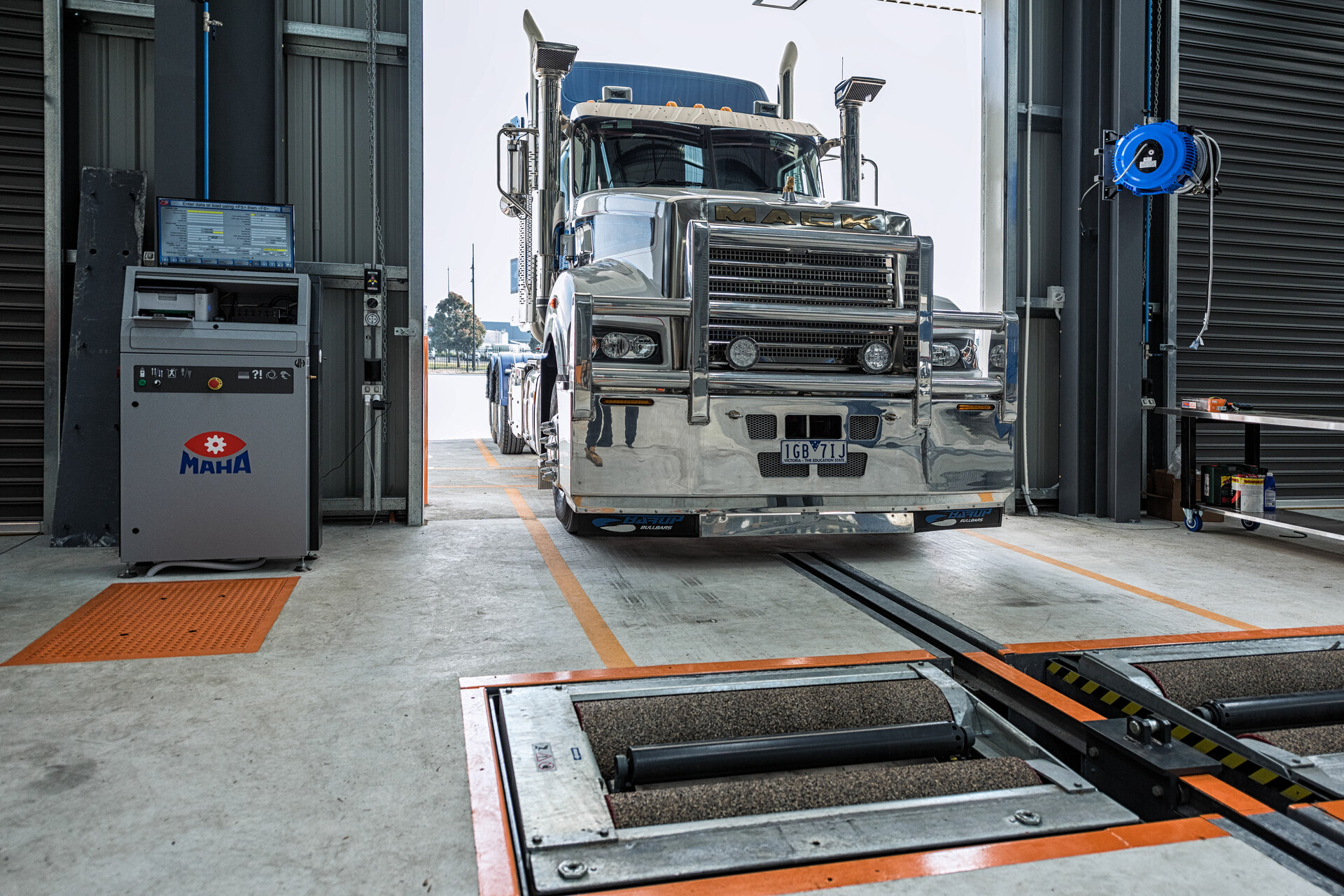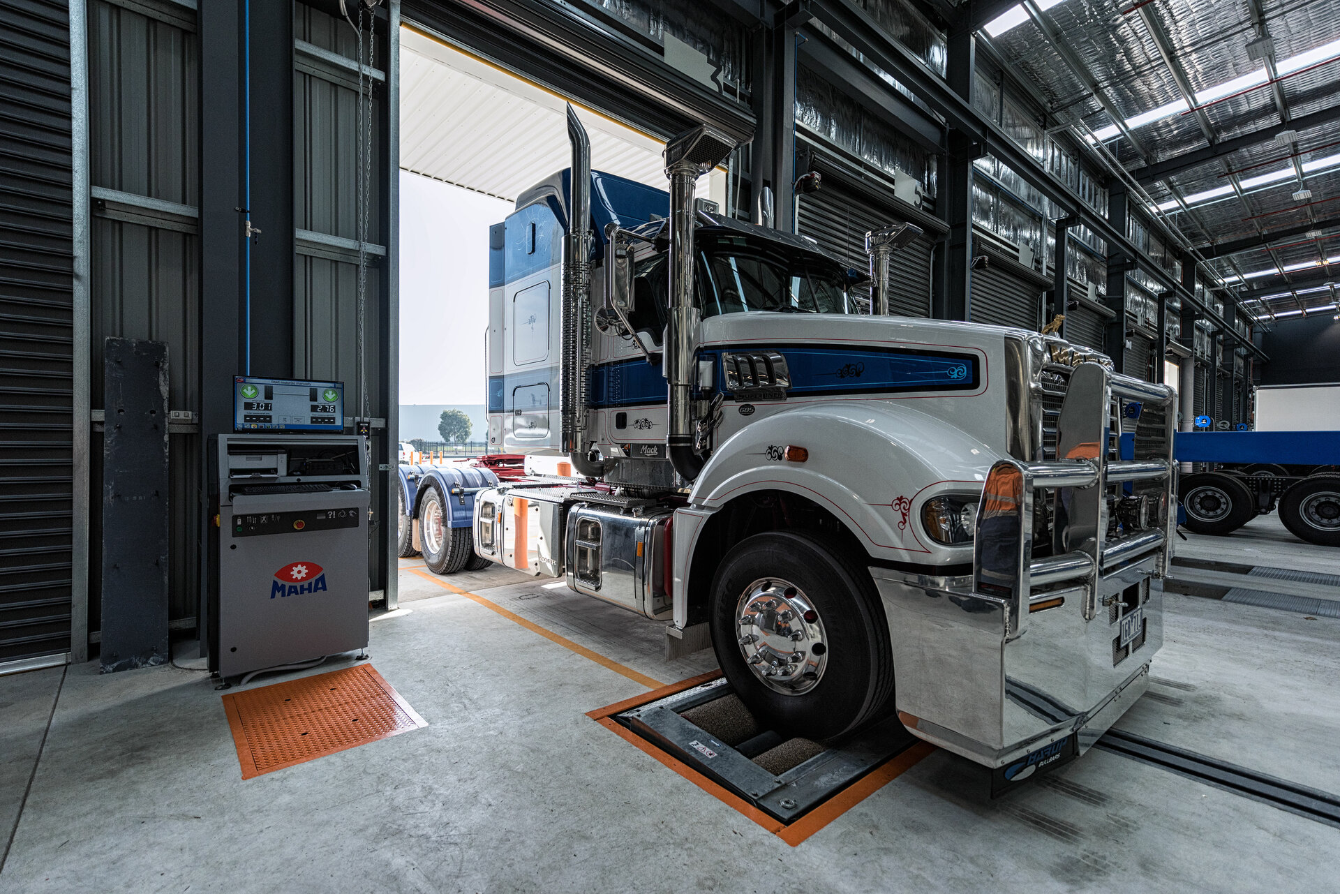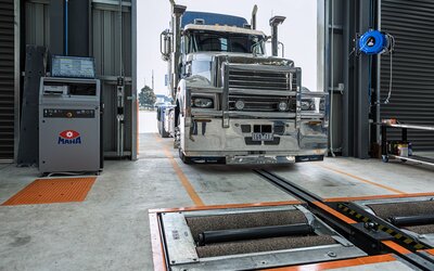 En el cliente se instalaron dos calles para inspección de frenos totalmente equipadas, inclusive elevación de juego de rodillos, simulación de carga y detector de holguras. Además, el emplazamiento dispone de un regloscopio digital integrado MLT 3000. Así, el equipamiento de la calle de ensayo está muy por encima de los estándares australianos. La calle de ensayo en la parte anterior se usa como puesto de trabajo de examinación para detectar problemas con la amortiguación, los frenos o los faros. La segunda calle de ensayo se encuentra en la parte posterior del foso del taller.