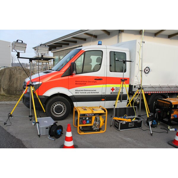 Haldenwang, le 27 février 2019. Le Groupe d’intervention rapide Technique et Sécurité, de la Croix Rouge de Bavière, est compétent pour intervenir pour l’infrastructure et la sécurité nécessaires. Il dispose d’une expertise et d’un équipement technique particuliers et, par ses connaissances en technique et en artisanat, il assure sur site la sécurité au travail nécessaire. « L’équipe assure l’exploitation technique, se charge en même temps de tâches logistiques et veille, entre autres, à l’alimentation en électricité et à l’éclairage, au chauffage, à l’alimentation en eau et à l’évacuation de l’eau, de même qu’aux installations sanitaires », explique Manfred Mortzard, chef de groupe au service d’assistance de la Croix Rouge de Bavière à Altusried-Dietmannsried. Pour que toutes ces tâches importantes puissent être prises en charge, lors d'une intervention, il faut un équipement particulier.